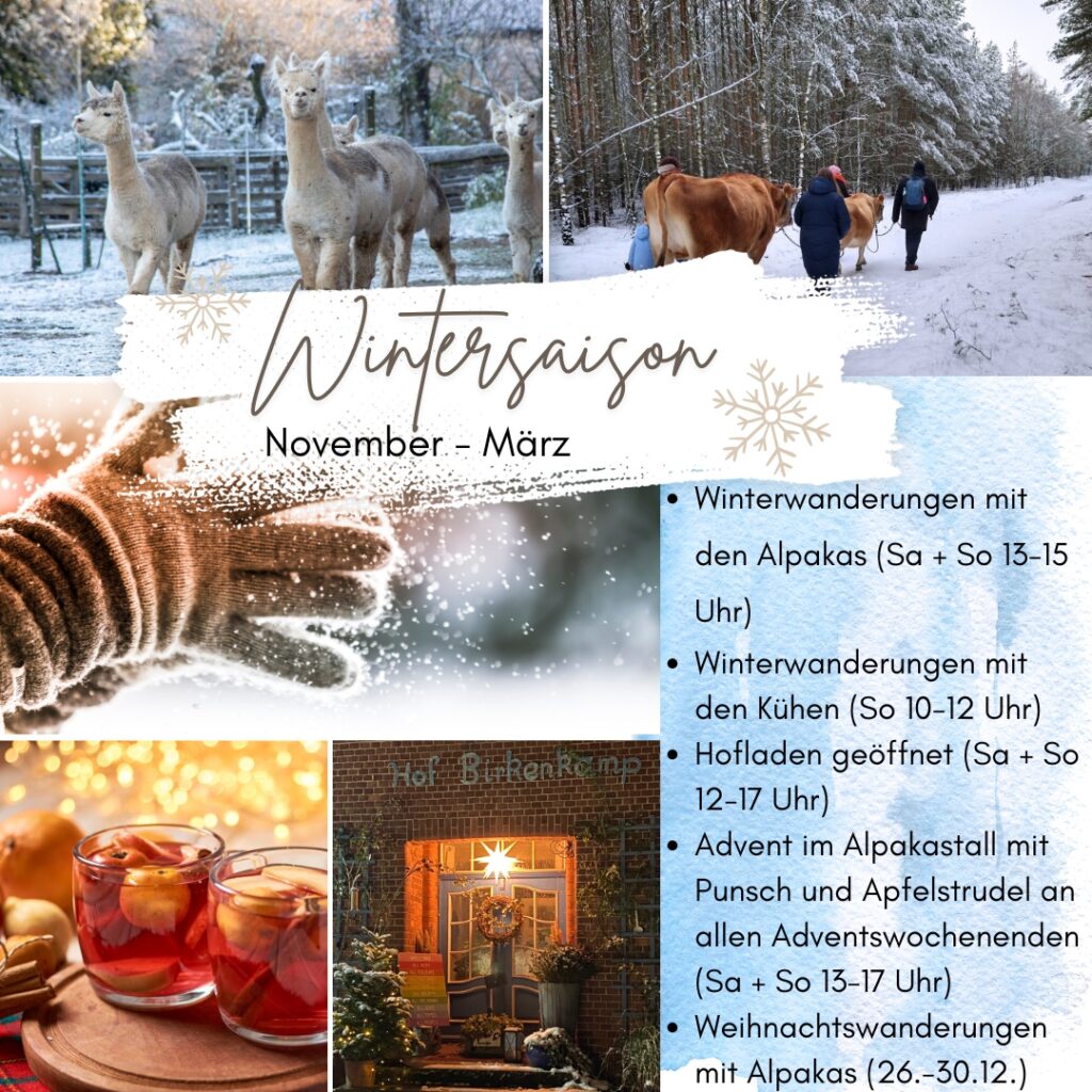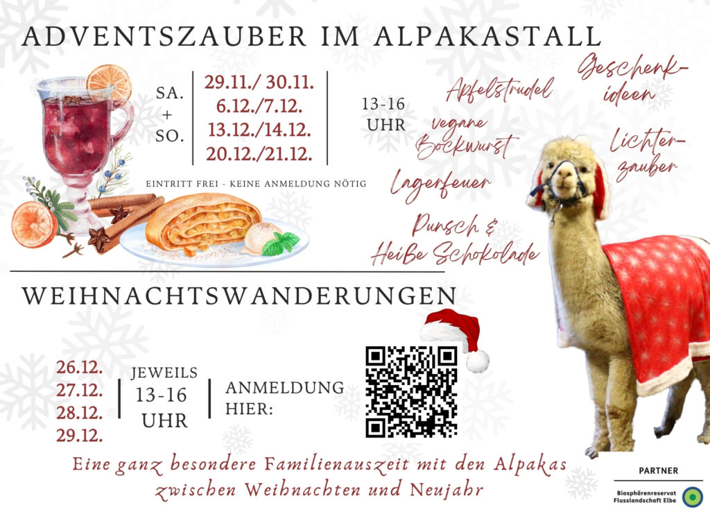 Am Samstag und Sonntag zum ersten Advent haben wir 12–17 Uhr für euch geöffnet – inklusive Hofcafé, Hofladen und unserer Kuhwanderung im Rahmen des Adventszauber im Alpakastall.