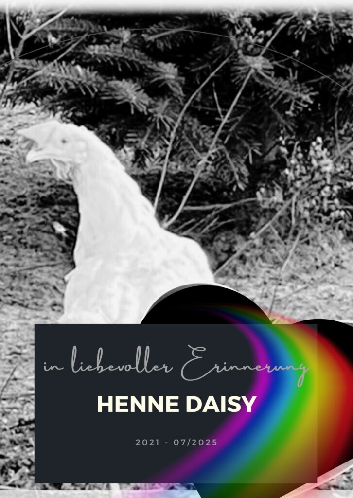Wie viele ihrer Schwestern trug sie die körperlichen Folgen der Überzüchtung. Ihre Darmmuskulatur versagte, die Eier wurden zur tödlichen Last. Wir konnten ihr nicht mehr helfen. Daisy starb an inneren Verletzungen.