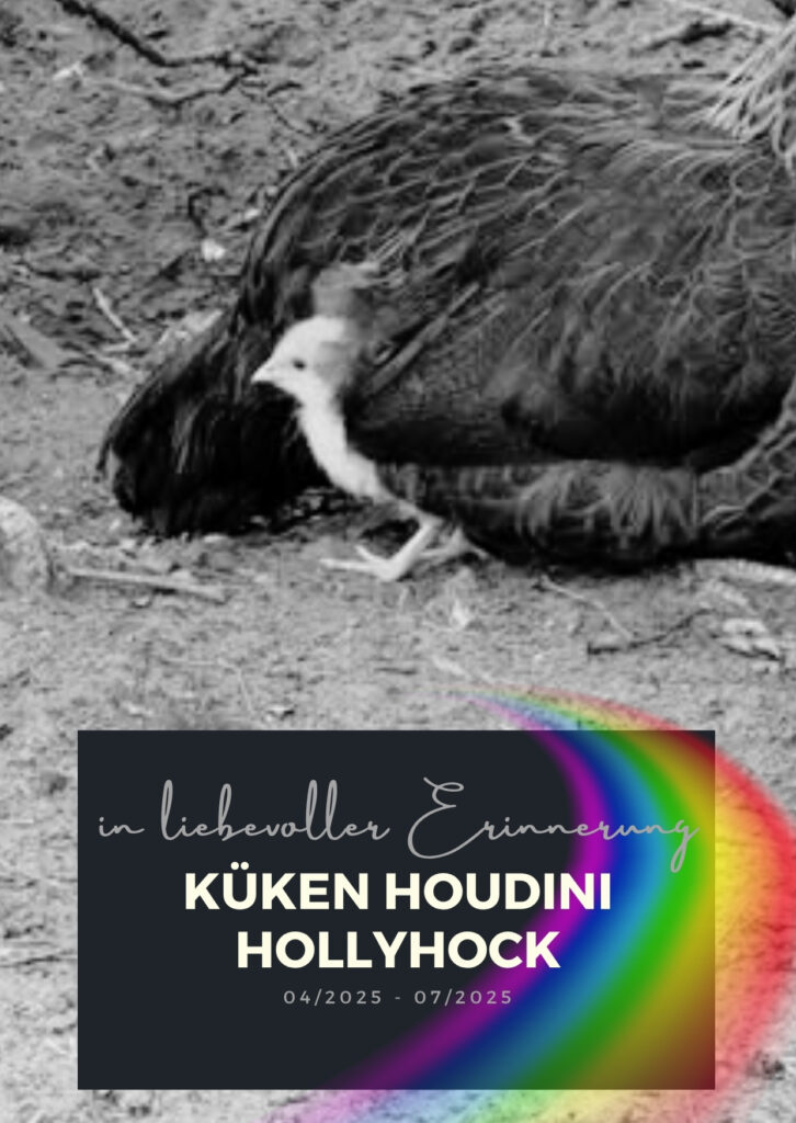 Hollyhock kam in diesem Jahr als kleines Überraschungsküken zur Welt – dank der meisterhaften Versteckkünste seiner Mutter Luzifera. Schon früh zeigte es, dass es ganz nach ihr kam: stark im Wesen, wild im Herzen und kaum zu bändigen.