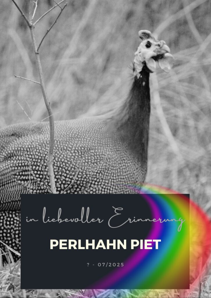 Piet kam gemeinsam mit Miyu und Perli Anfang 2025 nach einem tragischen Verlust ihres Vorbesitzers zu uns. Anfangs scheu, fand er schnell Gefallen an der Freiheit – und machte sich mit seiner lauten Stimme und seinem besonderen Aussehen unvergesslich.