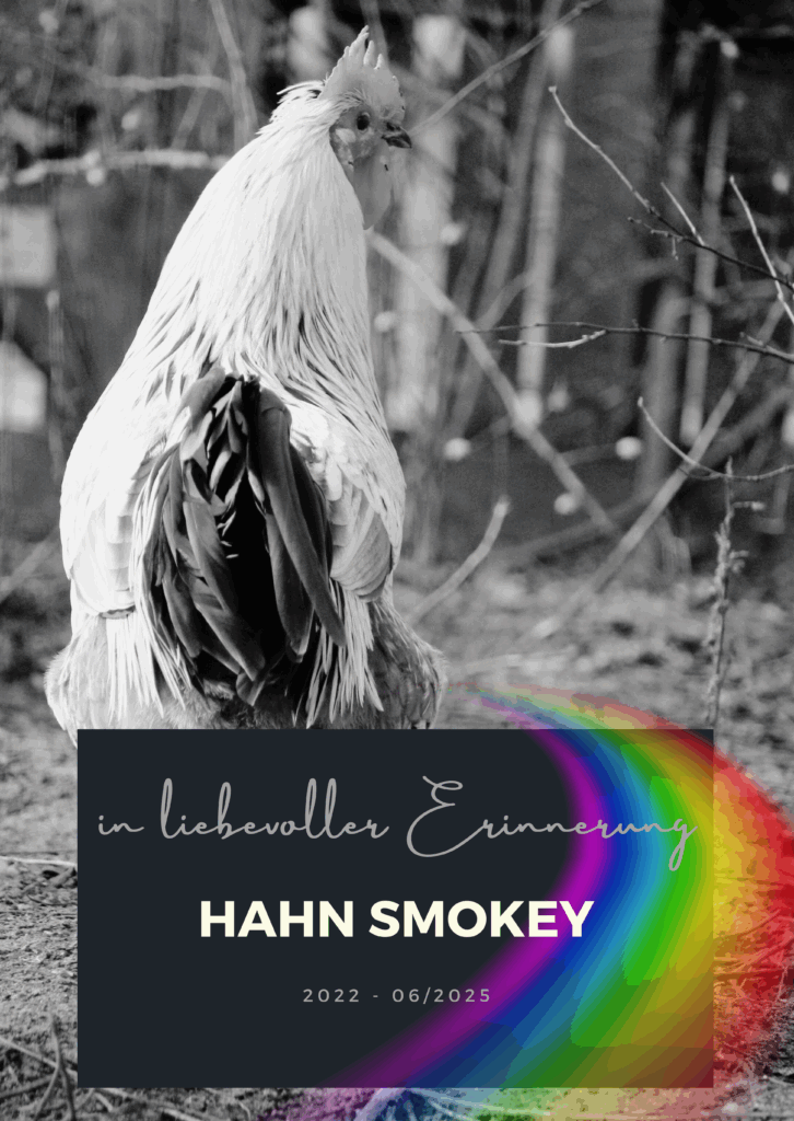 Bei einem seiner Ausflüge mit den Hennen, am Rand der Weide, wurde er am helllichten Tag von einer Füchsin angegriffen und schwer verletzt. Wir rannten – doch Smokey starb in unseren Armen.