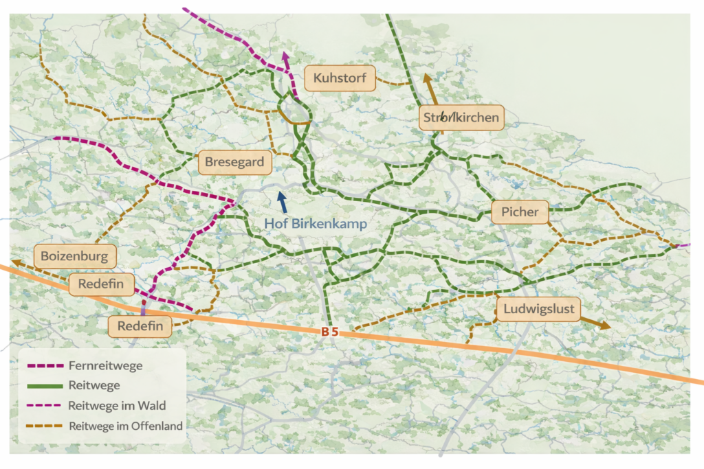 Der Hof Birkenkamp liegt im Landkreis Ludwigslust-Parchim, einer der reitfreundlichsten Regionen Mecklenburg-Vorpommerns.